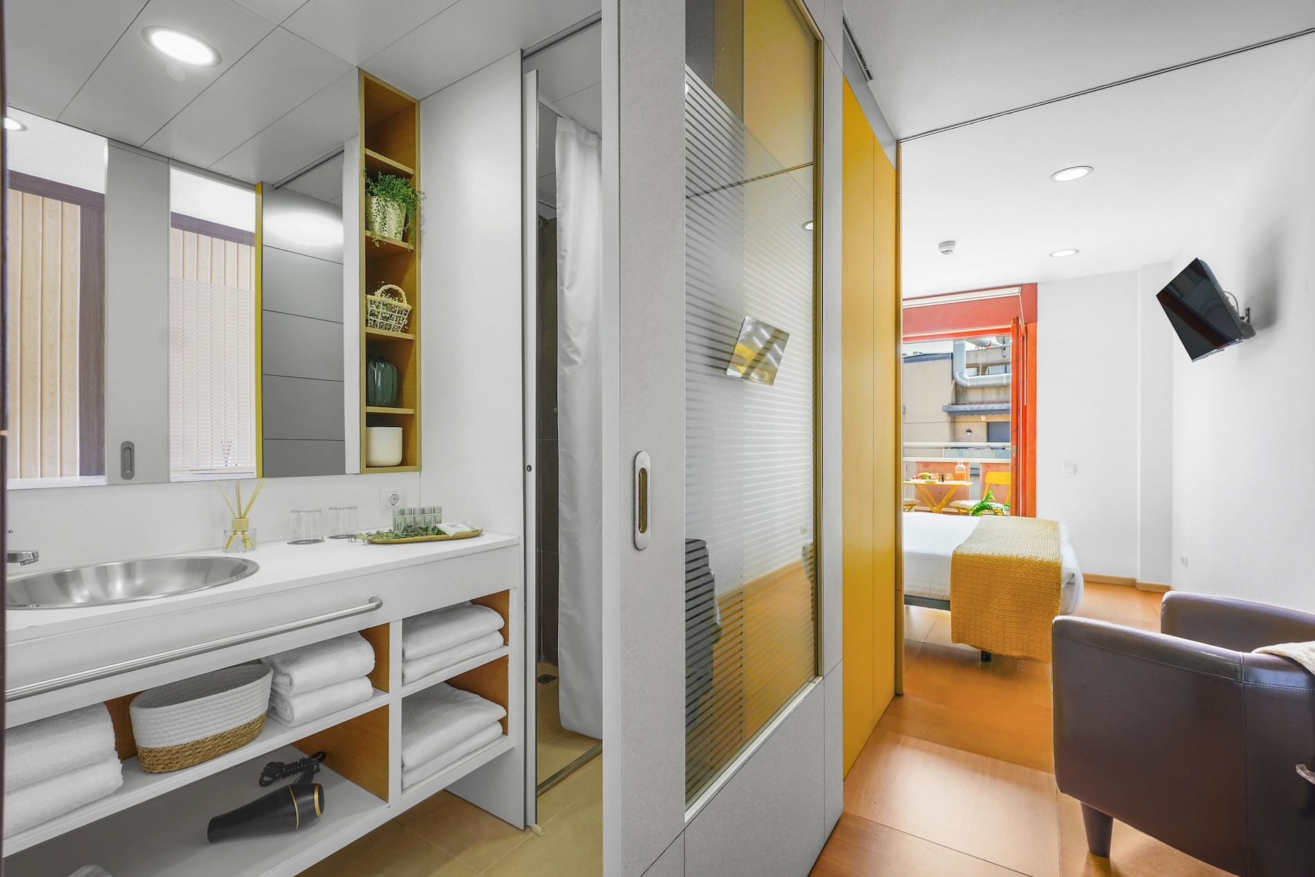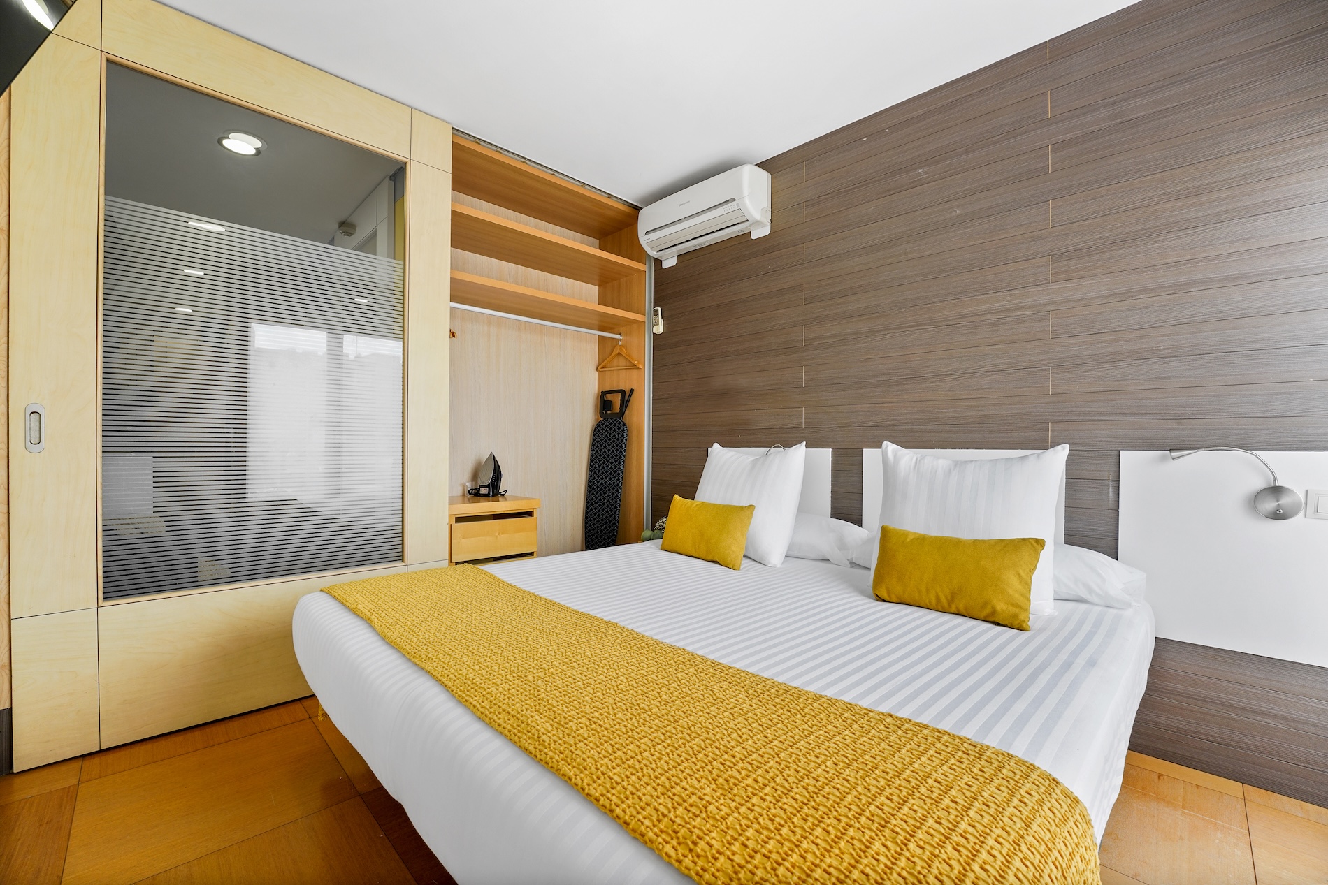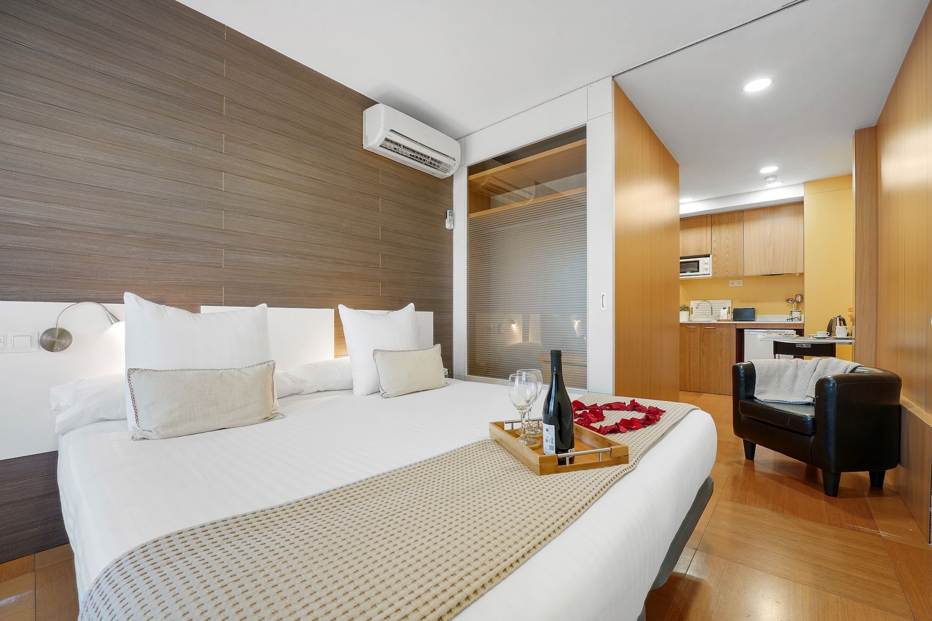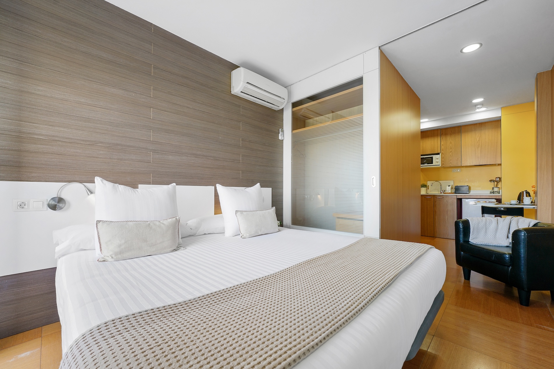 The apartments are bright, with functional décor and subtle colour details, and all have a flat-screen TV and kitchenette.