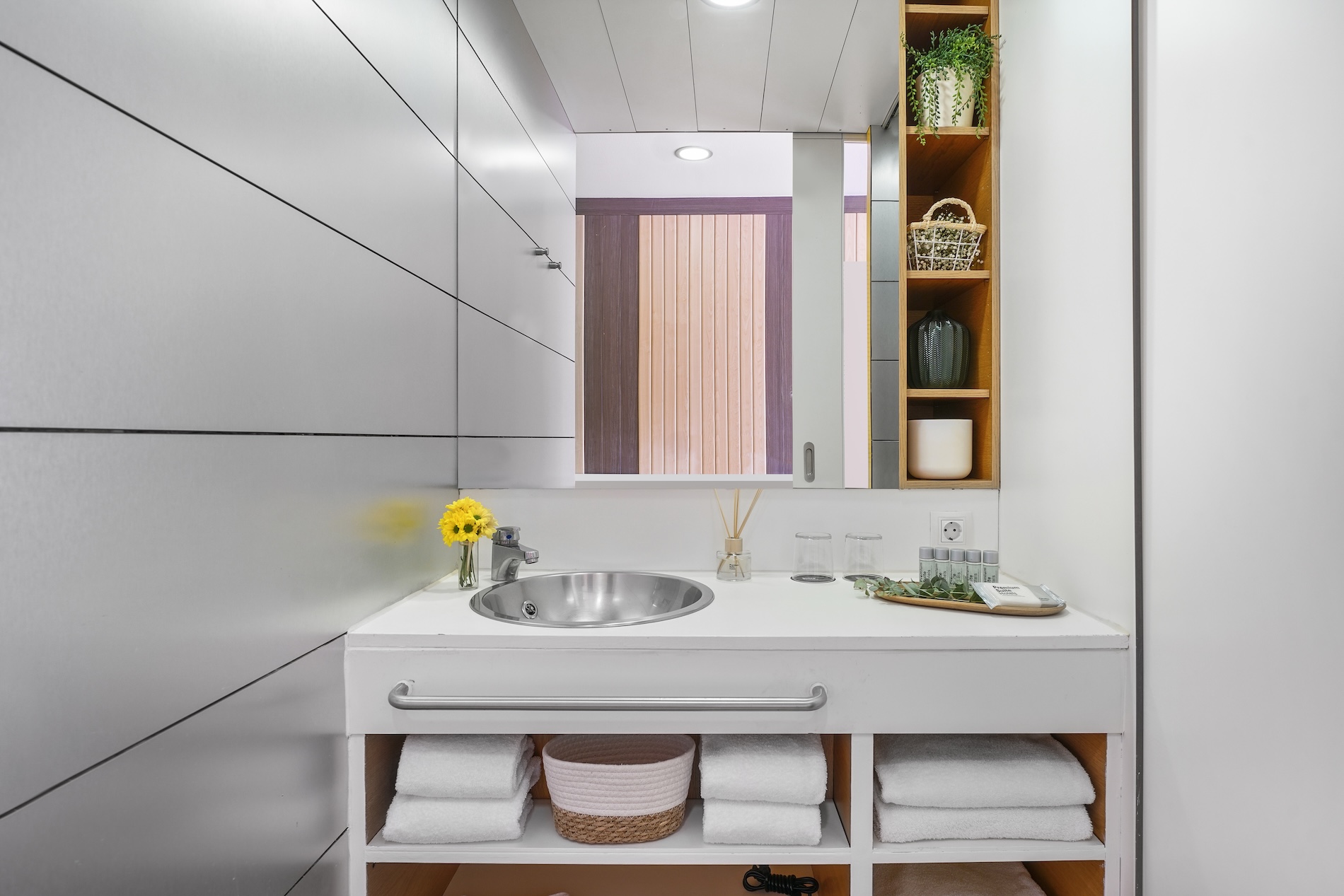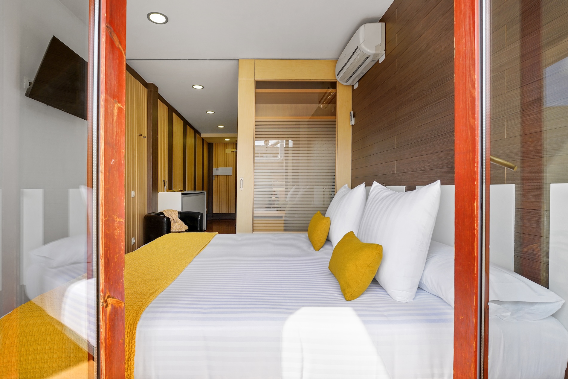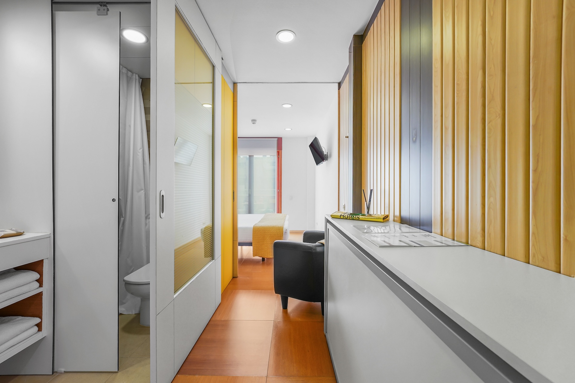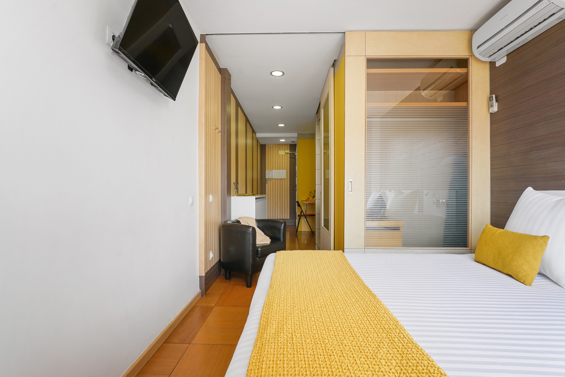 The apartments are bright, with functional décor and subtle colour details, and all have a flat-screen TV and kitchenette.